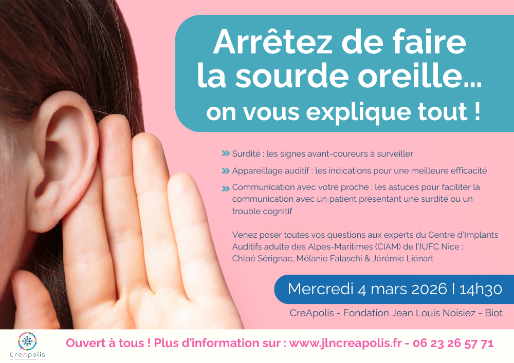 📅 Mercredi 4 mars – 14h30-16h00 📍En présentiel à CreApolis ✅ Conférence & table ronde 👥 Ouvert à tous : aidant, professionnels, étudiants ✏️ Inscription gratuite mais obligatoire Programme : ✅Surdité : les signes avant-coureurs à surveiller ✅Appareillage auditif : les indications pour une meilleure efficacité ✅Communication avec votre proche : les astuces pour faciliter […] |
